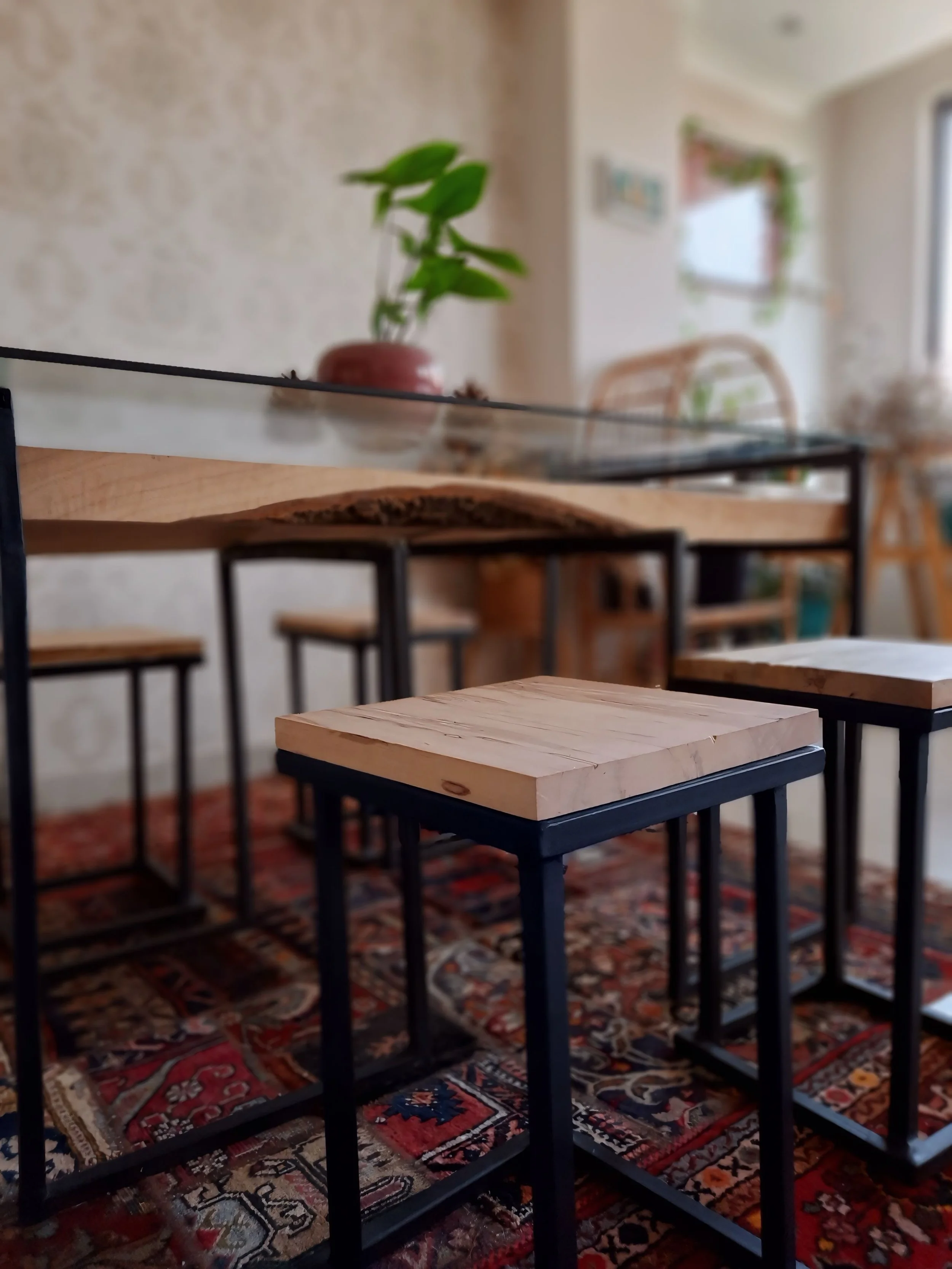A handcrafted dining table exploring harmony between organic wood and industrial materials.